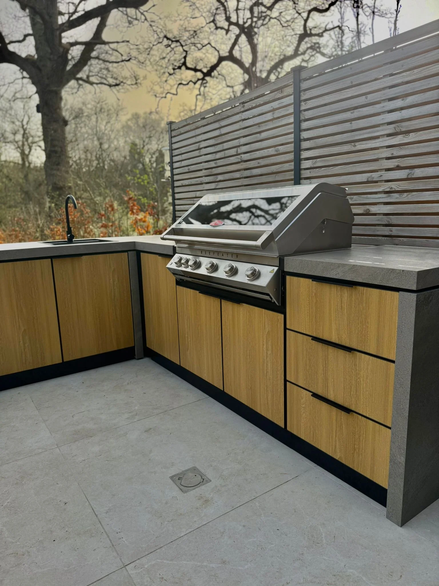 Compact kitchen integrated into a pergola setting, paired with a BeefEater 3000E.