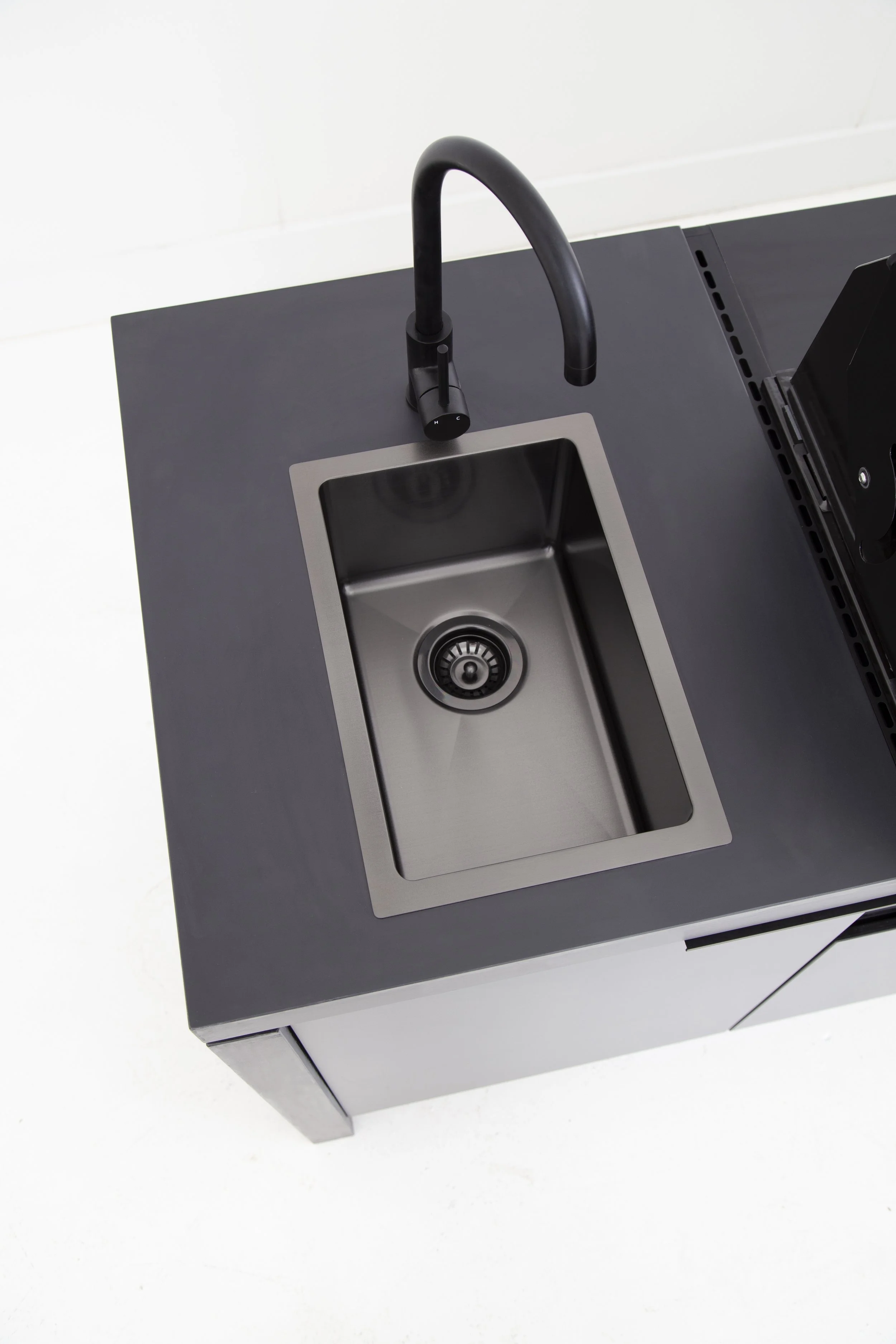 A sleek linear design, the worktops and waterfalls are finished in a black porcelain and anthracite door finishes which blend and suit a variety of different outdoor spaces. Complemented with the BeefEater 1700 series.