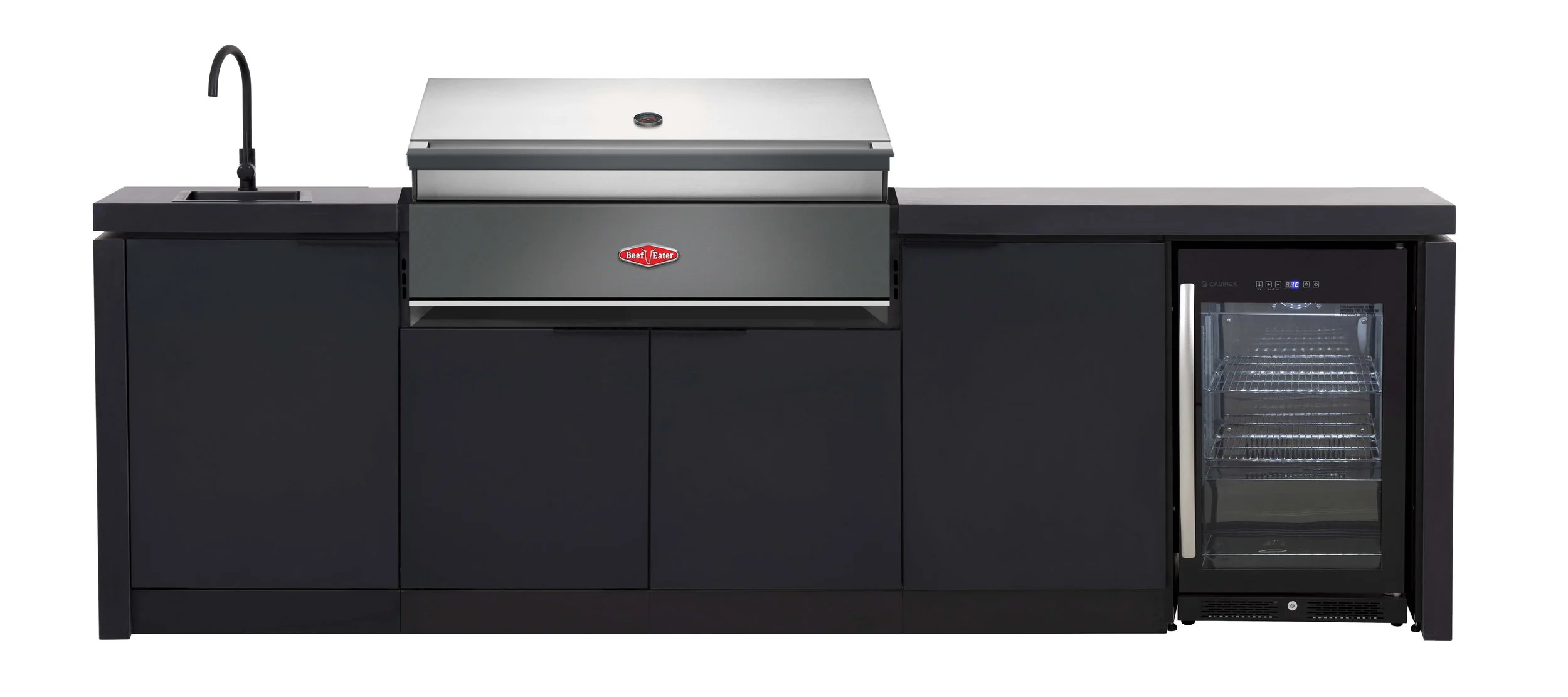 Includes a single cupboard with a black stainless steel mixer tap & small sink, BeefEater 1700 series BBQ, single cupboards and a single door premium 108 litre bar fridge.