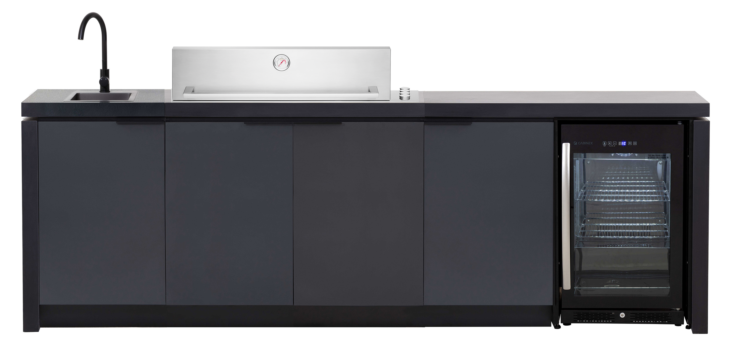 A sleek linear design, the worktops and waterfalls are finished in a black porcelain and anthracite door finishes which blend and suit a variety of different outdoor spaces. Complemented with the BeefEater Proline series.