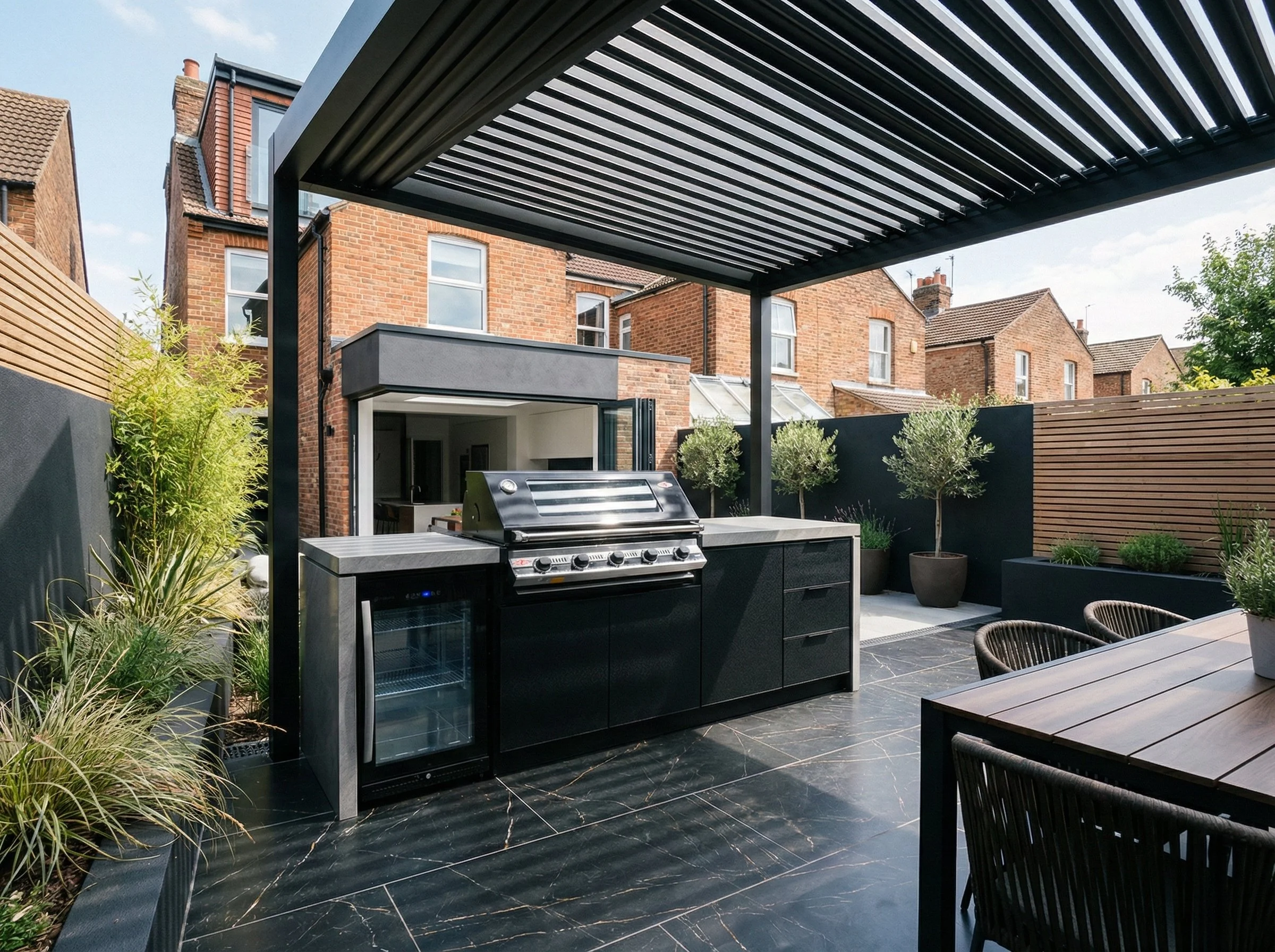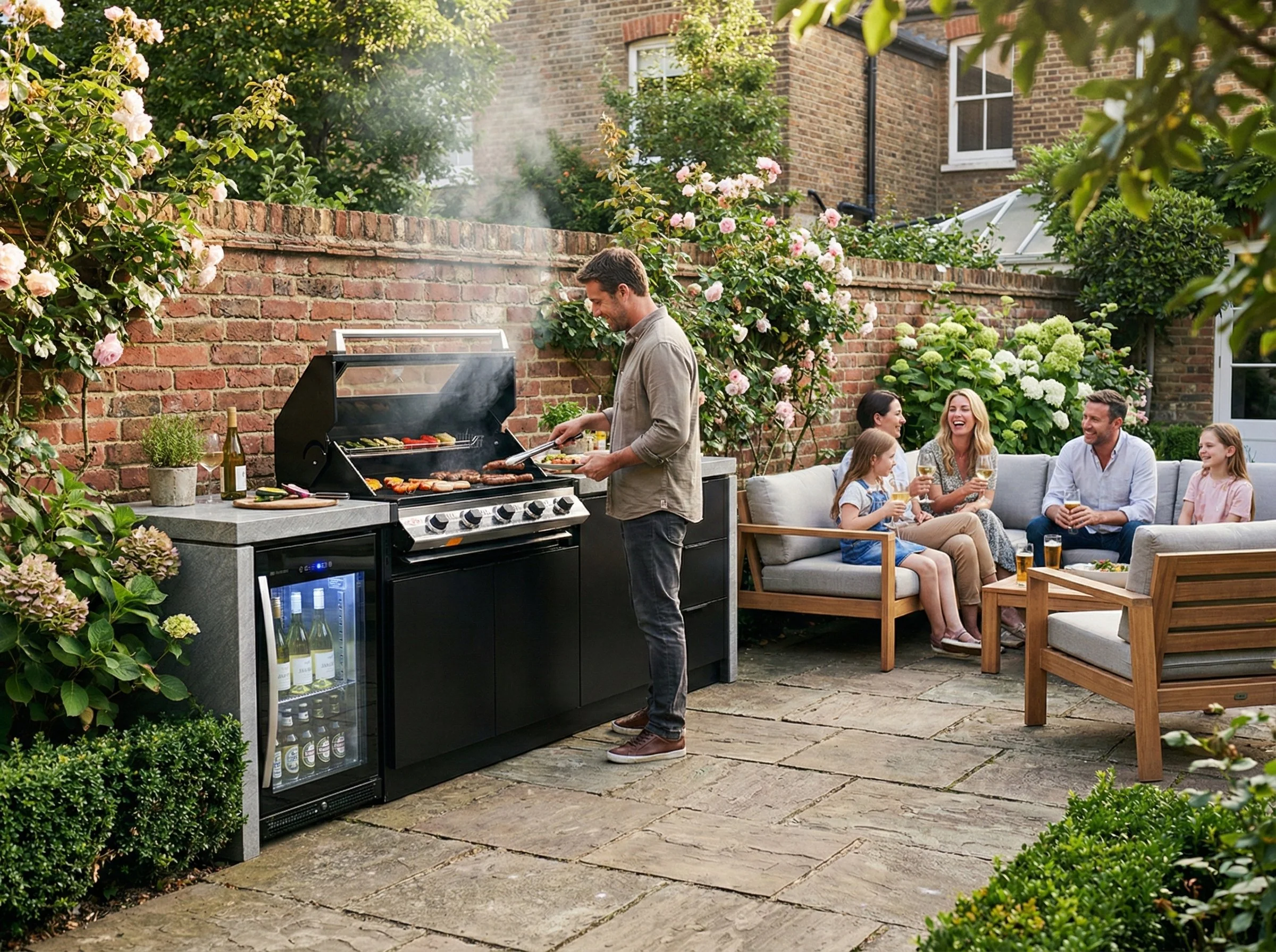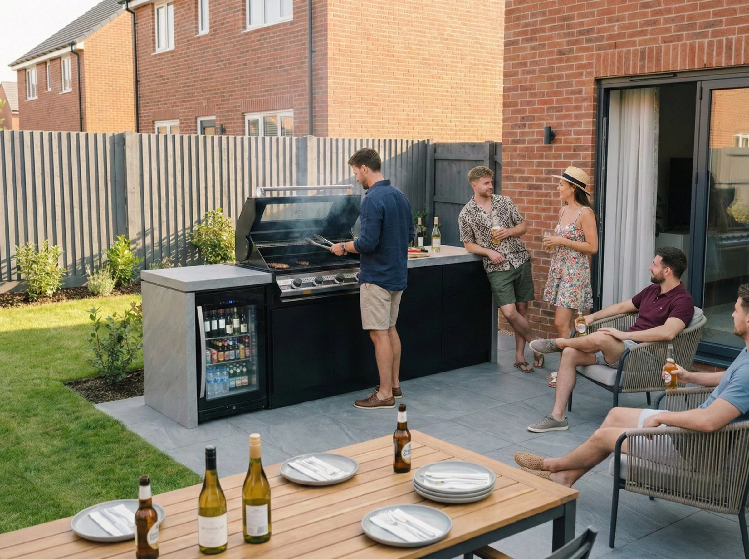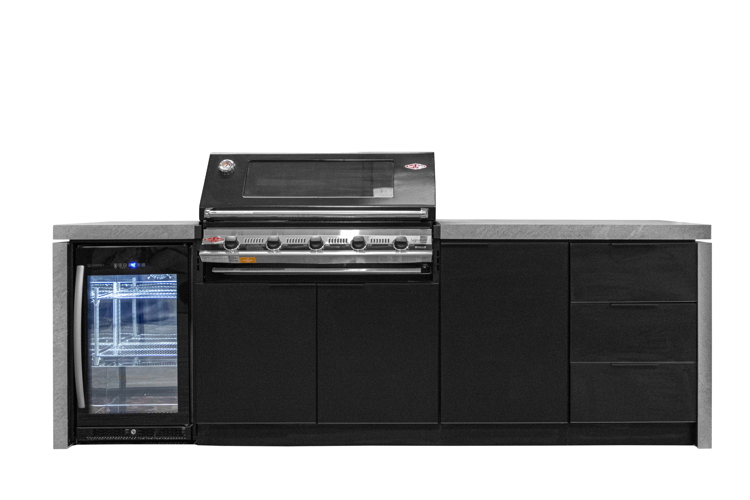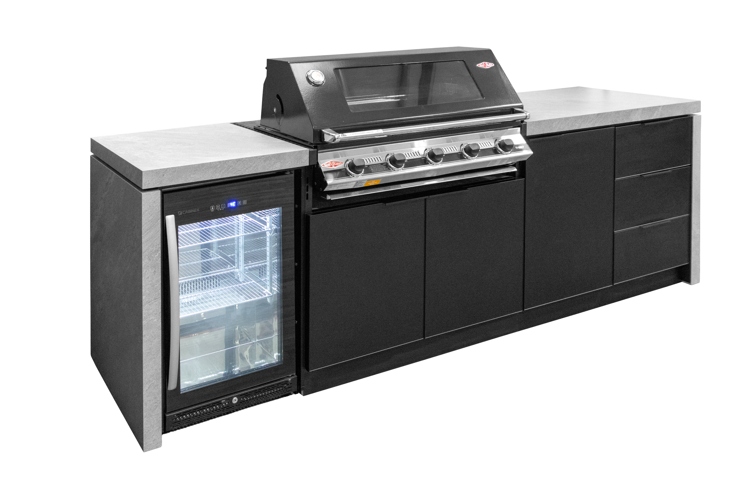 This outdoor BBQ kitchen configuration includes a premium black outdoor bar fridge, BBQ of your choice from a selected range, storage modules and a three-drawer unit - Designed for outdoor entertaining, featuring an added fridge to keep drinks cold and ingredients fresh whilst being within reach.