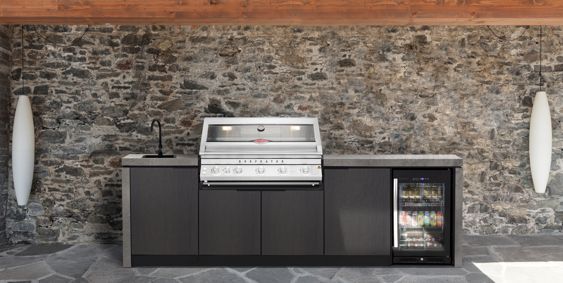 This outdoor BBQ kitchen configuration includes a single door storage unit with large sink and WRAS certified mixer tap, a premium black outdoor bar fridge, BBQ, single storage modules and a three-drawer unit. - Everything you need for flexible outdoor entertaining and cooking.