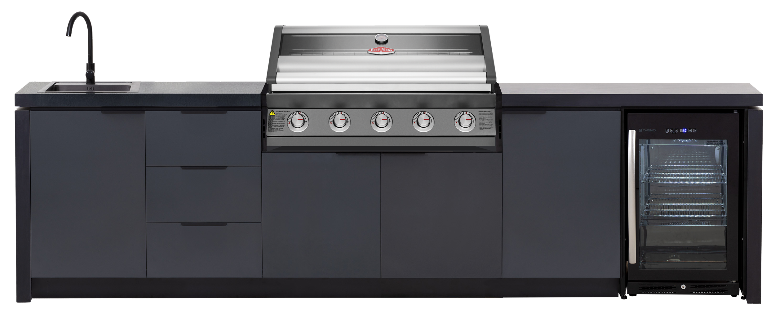 Includes a single cupboard with a black stainless steel mixer tap & large sink, x3 drawer unit, BeefEater 1600 series BBQ, single cupboards and a single door premium 108 litre bar fridge.
