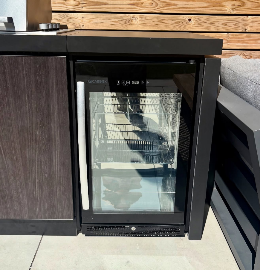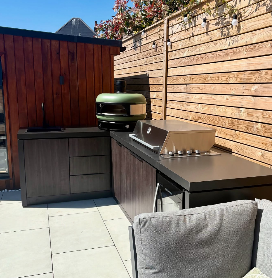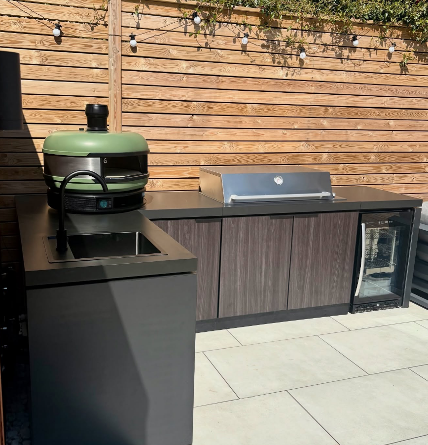 Modular system, a compact yet highly efficient outdoor kitchen was designed that maximised the available space without compromising on style or functionality. The cabinetry and worktop finishes were carefully selected to blend flawlessly with the existing garden cladding, creating a cohesive and aesthetically pleasing look.