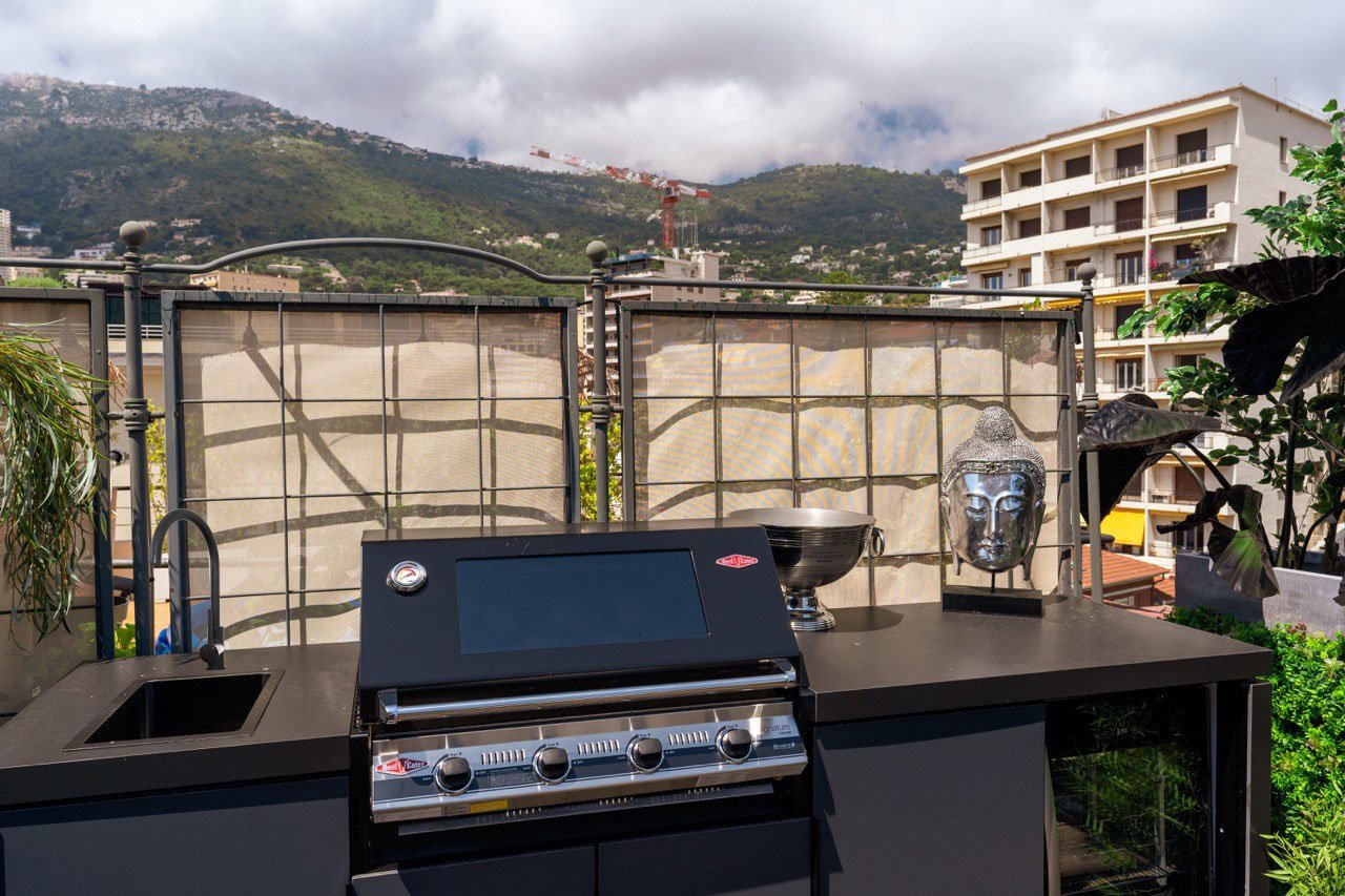 Nestled on a stunning rooftop balcony in the heart of Monaco, this outdoor kitchen project was designed to perfectly complement the luxurious surroundings while adhering to strict rooftop regulations. The client desired a spacious, functional area that wouldn't look out of place in their elegant setting. With a large, open space, the challenge was to ensure the kitchen sat comfortably without overwhelming the scene or appearing lost in the vastness.